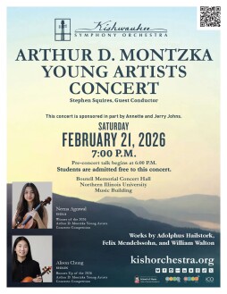 This concert will feature Neena Agrawal, the winner of the 2026 Arthur D. Montzka Young Artists Concerto Competition, performing the first movement of William Walton's Viola Concerto. In addition, the concert will include a performance of the first movement of Walton's Violin Concerto performed by Alison Chung, the ADM Concerto Competition runner-up.