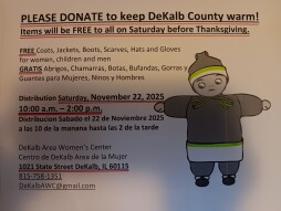 All are invited to this annual, FREE Winter Outerwear Give-away. FREE coats, jackets, hats, scarves, gloves, boots, heavy sweaters, heavy sweatshirts in women's, children's, men's sizes for ANYONE who shows up 10am-2pm on the Saturday before Thanksgiving 11/22/25 at DAWC 1021 State Street, DeKalb, IL. Donations needed on top step through 11/20/25.