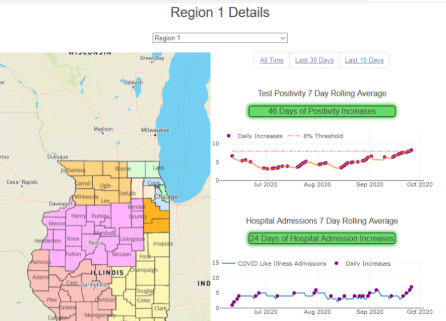 The release says IDPH will track the positivity rate in Region 1 to determine if mitigations can be relaxed, if additional mitigations are required or if current mitigations should remain in place.